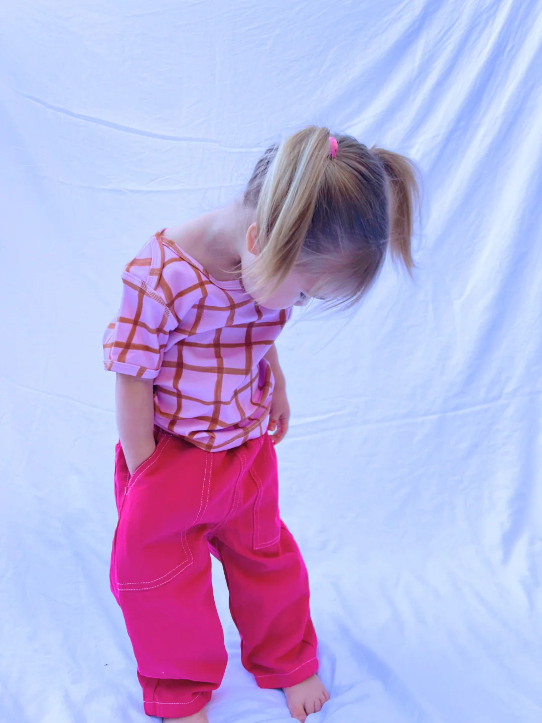 Elasticated waist, side and back pockets, and contrast topstitching. Looks great cuffed.